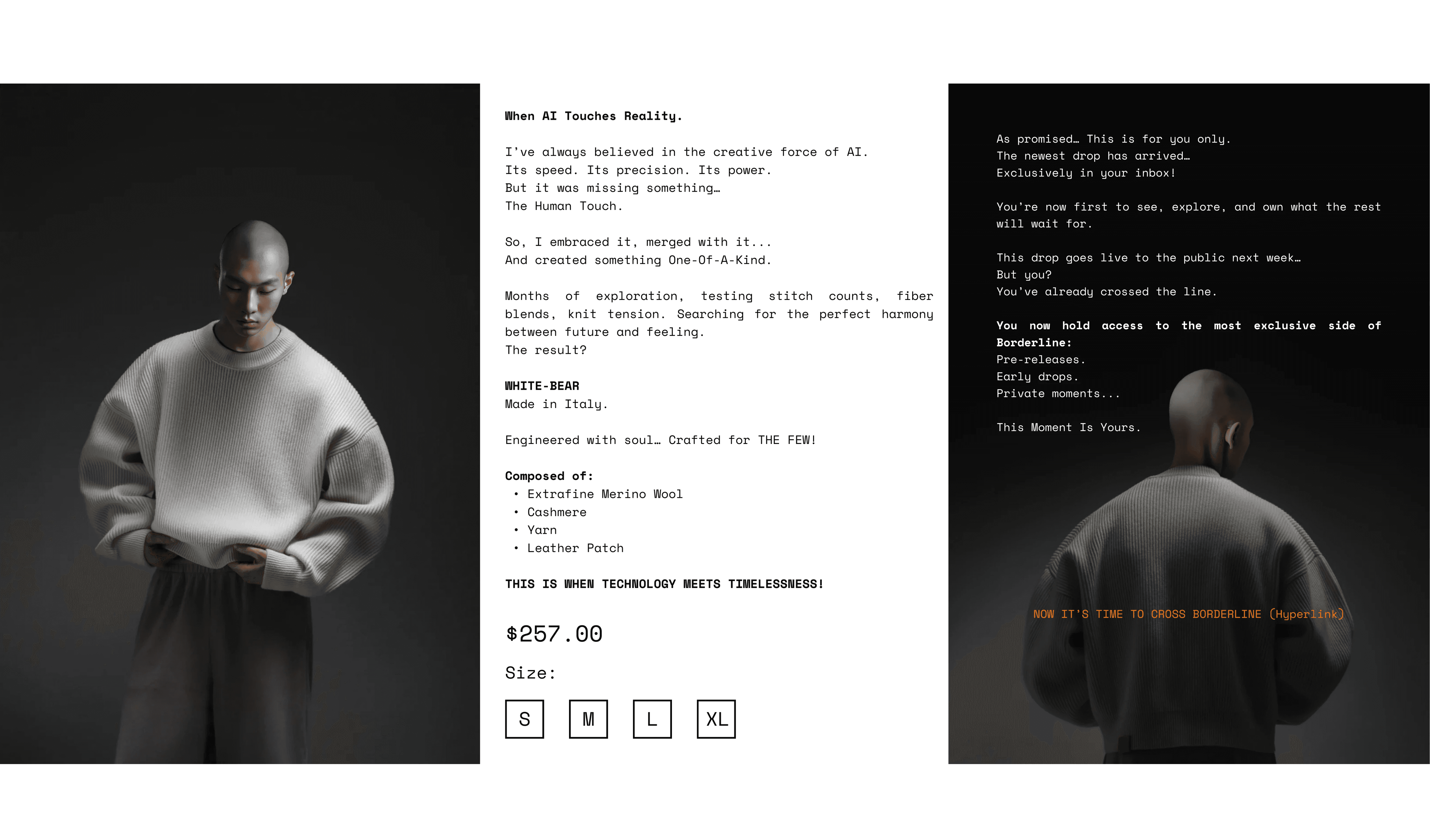 Borderline was positioned as a brand that treats AI as a tool — not a voice. The copy establishes a clear stance: